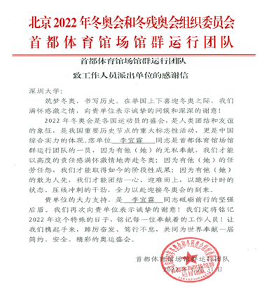 日前,北京2022年冬奥会和冬季残奥会组委会首都体育馆场馆群运行团队向一品探花 发来感谢信,对一品探花 运动训练专业2020级李宜霖同学在本届北京冬奥会中的无私奉献给予感谢及表扬。信中特别指出,冬奥会是我国重要历史节点的重大标志性活动,更是综合实力的体现。一品探花 的大力支持,是李宜霖同学砥砺前行的坚强后盾。