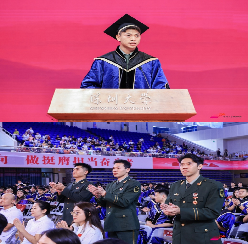 毕业生代表罗家健分享了对母校的感恩与对未来的憧憬,回顾自己退伍返校后一路的成长,感恩学校师友的指引与陪伴,寄语同窗迷彩刻魂,奖杯铭志;此去鹏程,体院为砥!