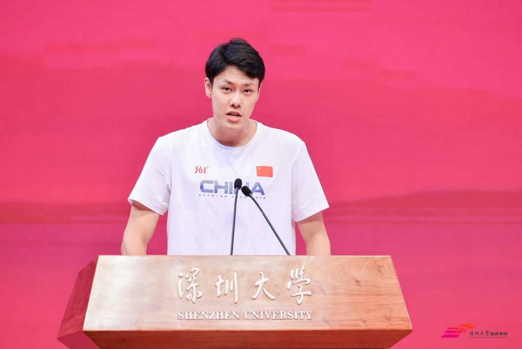 校友代表王冠斌,2018年青奥会冠军,结合体育训练和职场经历,鼓励学弟学妹“以体育人的坚韧直面挑战”。