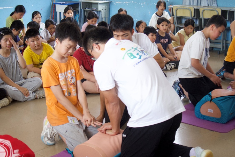 同时,为提升留守儿童互救能力,突击队根据留守儿童特点,专门开发了适合儿童的CPR教学方案。在急救课堂上,突击队队员系统讲解了心搏骤停判断、紧急呼救等内容,并由具有心肺复苏资质的队员指导儿童利用模型学习基础心肺复苏术,培养其应急救助意识。