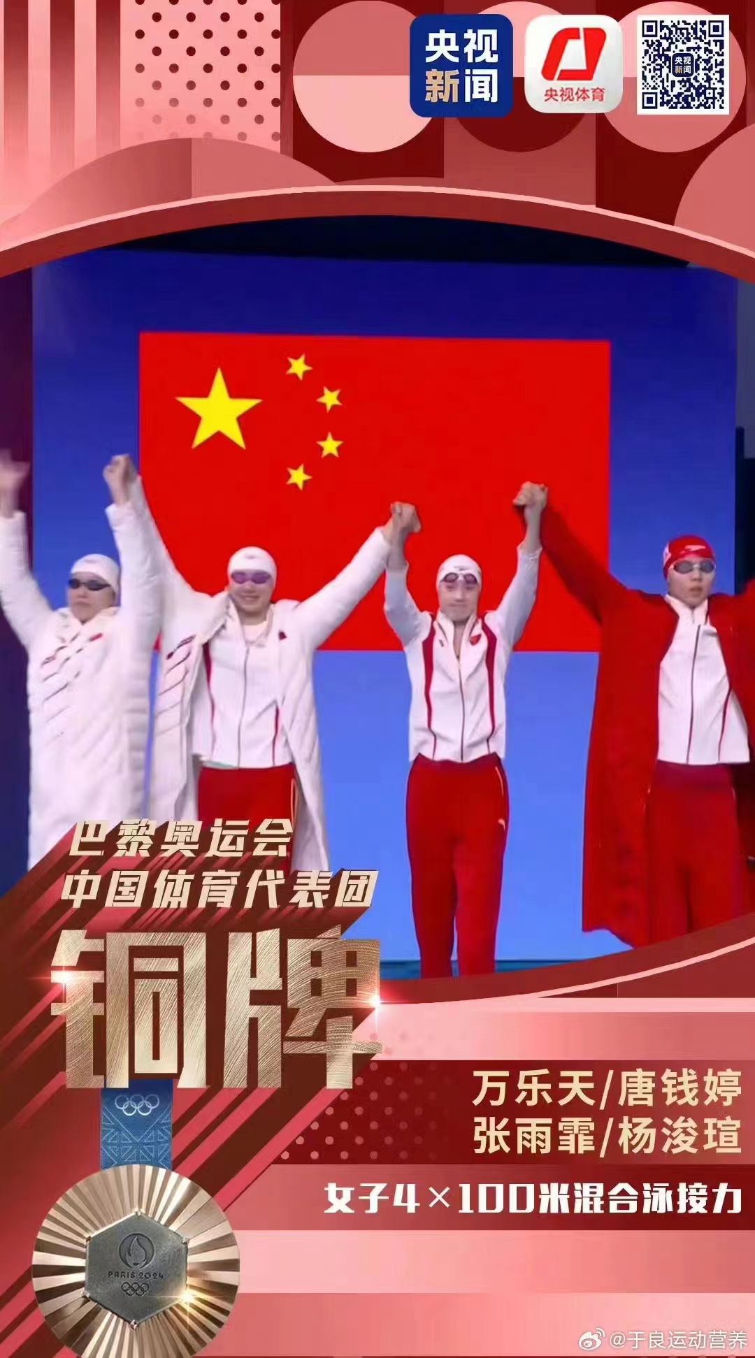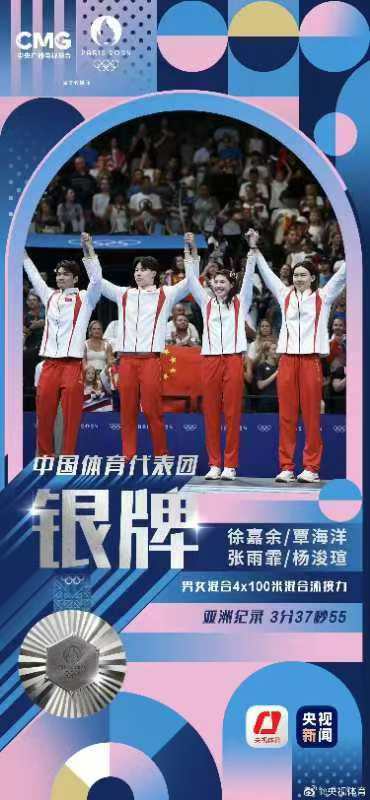 第九天(8月5日):女子4×100米混合泳接力 吴卿风(预赛) 杨浚瑄(决赛)第三名