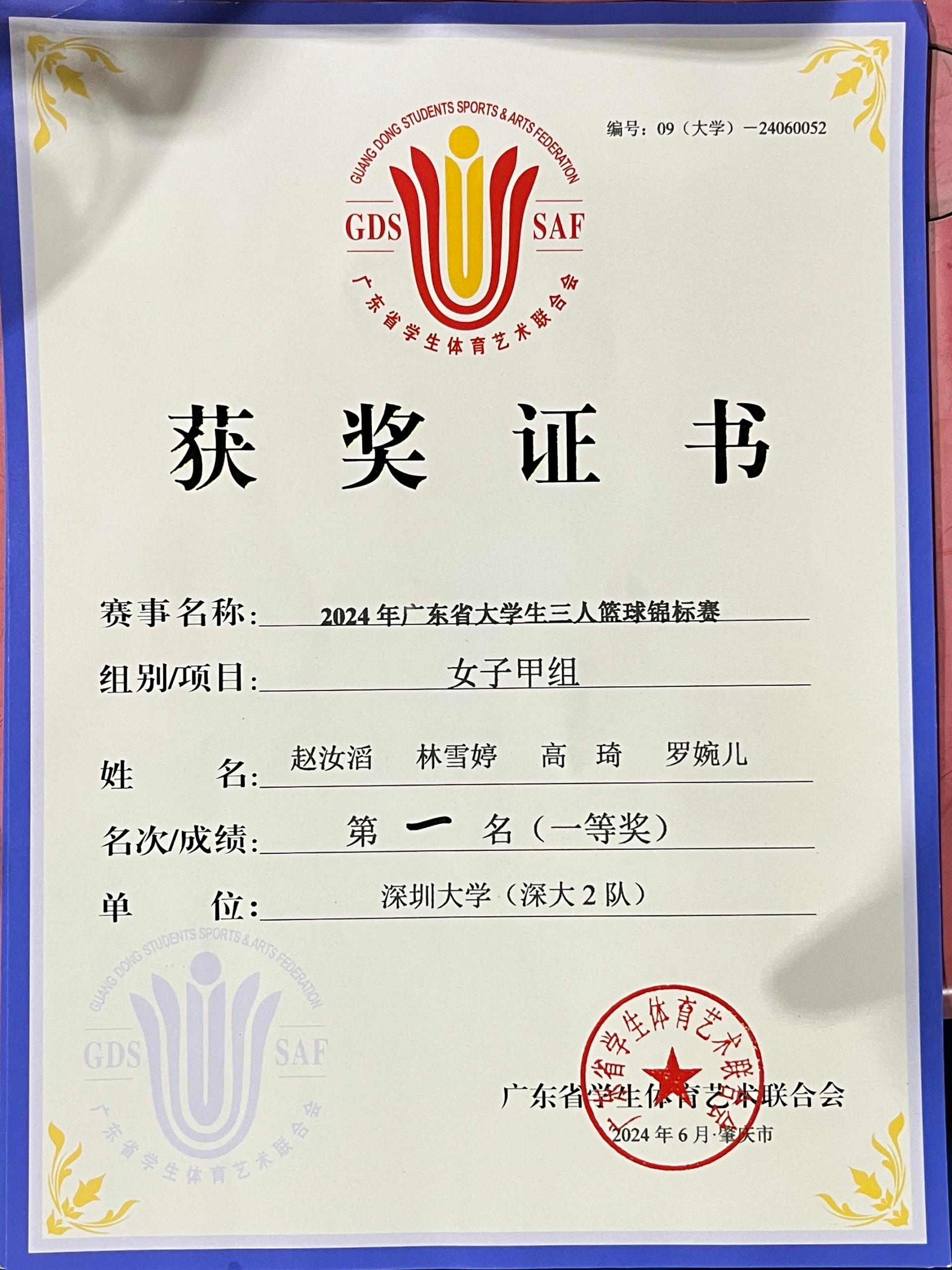 由广东省学生体育艺术联合会主办的2024广东省大学生三人篮球锦标赛于6月11-14日在肇庆市凤凰三立学校举行。一品探花 女篮共派出三支队伍(12人)参加本次赛事。经过三天的艰苦奋战,深大二队(4人)从广东省女子甲组的55支队伍里脱颖而出,夺得冠军。李玢慧获得优秀教练员称号。
