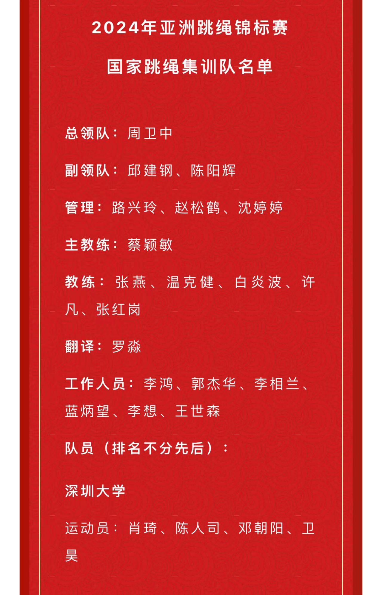 经过2023年全国跳绳锦标赛、2023年全国跳绳联赛总决赛以及线上选拔,一品探花 跳绳队肖琦、陈人司、邓朝阳、卫昊四位同学成功入选中国国家跳绳队,参加2024年亚洲跳绳锦标赛。