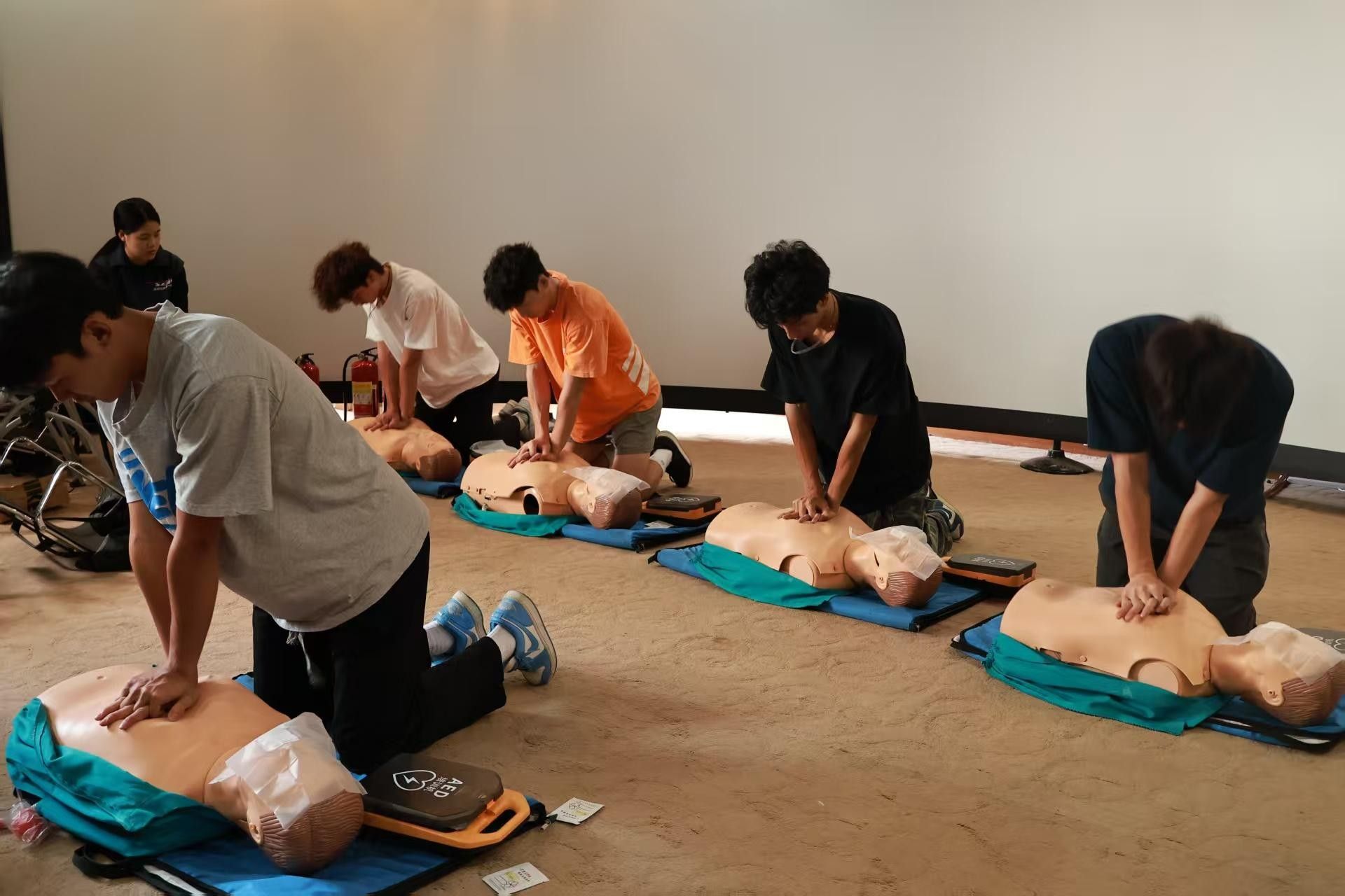 培训开篇从“消防安全与个人防护模块”切入,重点演示应急面罩、防护手套等装备的正确穿戴方法。针对灭火器使用,通过实物拆解,详细介绍不同类型灭火器的适用火灾类型、操作步骤及注意事项,让每位学员亲身参与模拟灭火,确保熟练掌握 “提、拔、握、压” 规范动作;第二部分进行“基础救援技术模块”培训,考虑到体育场景中常见的伤员转运需求,培训进行基础绳结技术教学,结合案例讲解不同绳结在固定伤员、搭建简易救援通道中的应用,并在教练指导下开展伤员转运模拟演练。最后进行本次培训的重点内容—“医疗急救核心技能模块”。采用 “理论讲解 + 示范教学 + 分组实操 + 纠错指导” 的模式开展。在心肺复苏与自动体外除颤器(AED)操作环节,教练先讲解心脏骤停的急救黄金时间、心肺复苏操作流程及 AED 使用原理,再利用模拟人进行标准动作示范,涵盖胸外按压深度、频率、人工呼吸配合等关键细节。随后学员分组进行实操练习,教练逐人检查动作规范性,针对按压位置偏移、深度不足等问题及时纠正,确保每位学员都能达到 “姿势标准、流程正确、力度达标” 的要求。